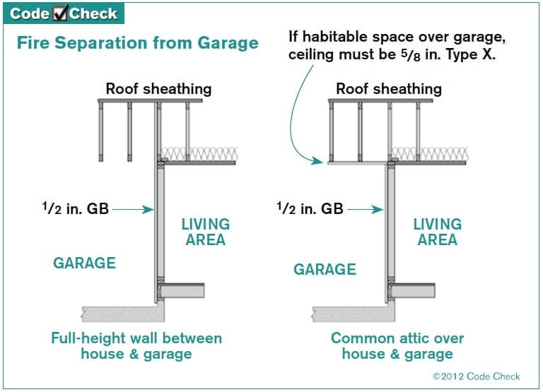 Residential building codes require certain important fire-resistant features between an attached garage and living space.