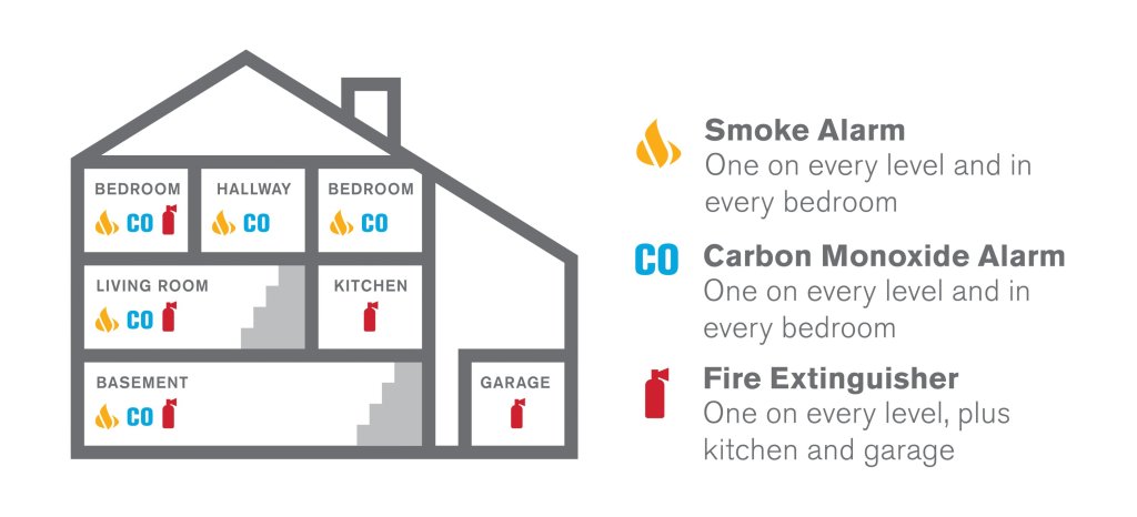 - Carbon monoxide alarms on every level and outside sleeping areas.
